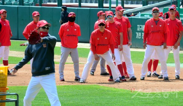 28일 인천 SK행복드림구장에서 SK 와이번스가 자체 훈련을 가졌다. SK 염경엽 감독이 직접 마운드에 올라 공을 던지는 가운데 최정이 동료들과 함께 주루 훈련을 하고 있다.