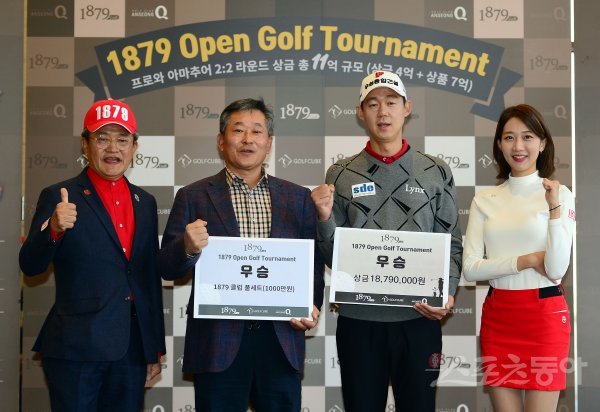 프로와 아마추어 총 280여 명이 참가하는 ‘1879 오픈 골프 토너먼트’ 1차대회 본선이 28일 경기도 안성 골프클럽 안성Q에서 열렸다. (왼쪽부터)1879골프 이동현 회장, 아마추어 우승자 곽광호 씨. 프로 우승자 이동하 프로. 이민지 1879골프 모델(2015 미스코리아 진)이 기념촬영을 하고 있다.