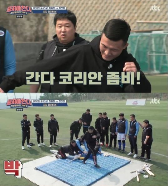 3일 방송된 종합편성채널 JTBC '뭉쳐야 찬다'에서는 '코리안 좀비' 정찬성과 '스턴건' 김동현은 야구 배트 격파 대결을 펼쳤다.
