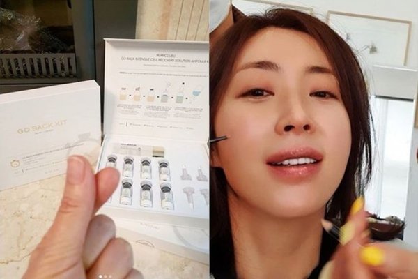 사진 속 송윤아는 화장품 선물을 받고 손하트 포즈를 취한다. 또한, 아들이 만든 장난감 블록을 인증하기도 했다.