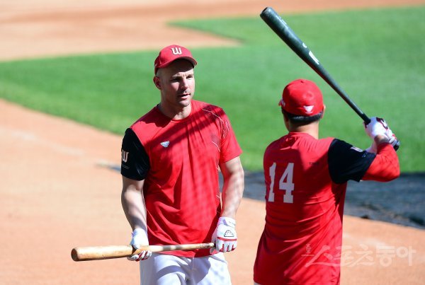 경기 전 SK 로맥이 최정의 타격을 바라보고 있다.