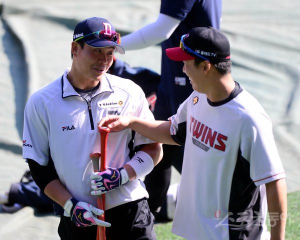 두산 박세혁이 LG 차우찬을 장난스럽게 바라보고 있다.