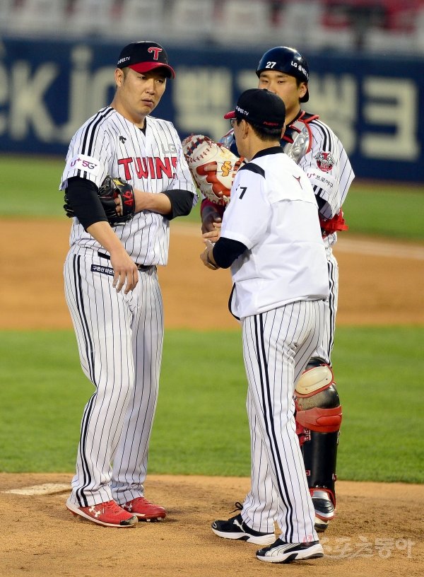6일 서울 잠실야구장에서 ‘2020 신한은행 SOL KBO 리그’ 두산 베어스와 LG 트윈스의 경기가 열렸다. 선발 투수로 등판한 LG 송은범이 3회초 1사 1,2루 상황에서 강판되고 있다.
