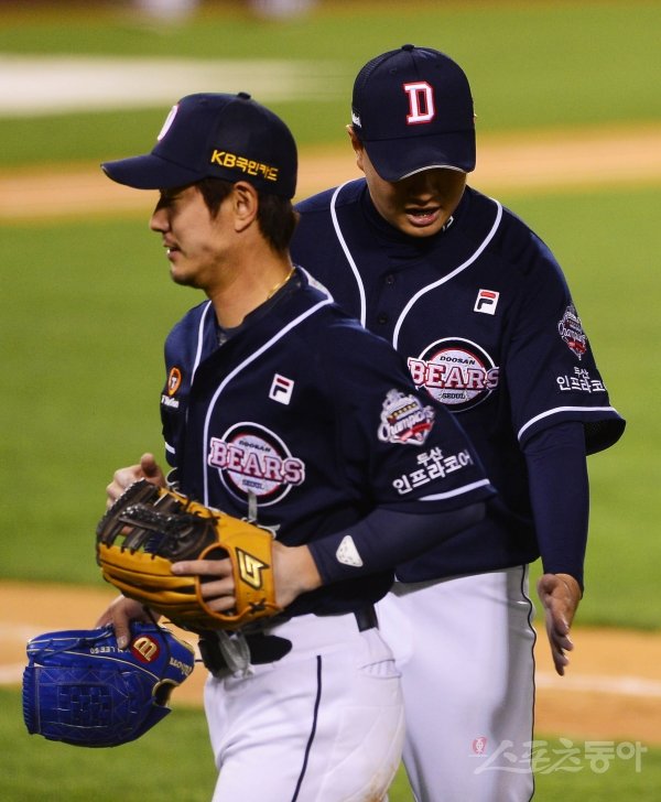 6일 서울 잠실야구장에서 ‘2020 신한은행 SOL KBO리그’ LG 트윈스와 두산 베어스의 경기가 열렸다. 5회말 수비를 마친 두산 이영하가 유격수 김재호의 엉덩이를 치고 있다.