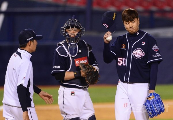 6일 서울 잠실야구장에서 ‘2020 신한은행 SOL KBO리그’ LG 트윈스와 두산 베어스의 경기가 열렸다. 7회말 1사 1루 상황에서 두산 이영하가 마운드를 내려가며 미소짓고 있다.