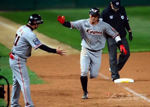 9회초 2사에서 한화 송광민이 솔로 홈런을 쏘아 올린 뒤 전형도 코치의 환영을 받고 있다.