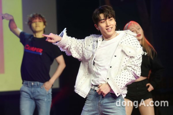 문종업이 7일 오후 서울 강남구 일지아트홀에서 열린 첫 번째 싱글앨범 \'HEADACHE\' 발매 쇼케이스에서 새로운 무대를 선보이고 있다.