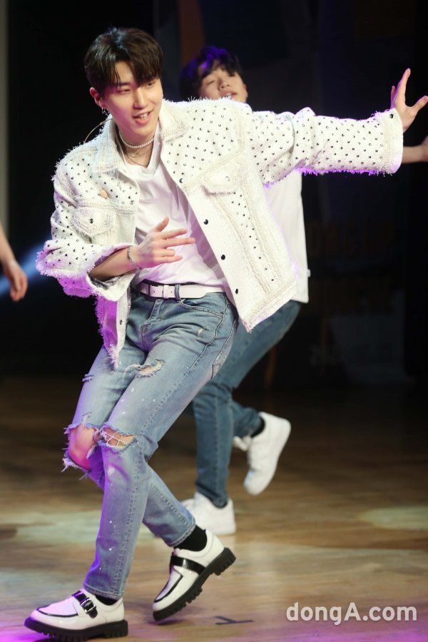 문종업이 7일 오후 서울 강남구 일지아트홀에서 열린 첫 번째 싱글앨범 \'HEADACHE\' 발매 쇼케이스에서 새로운 무대를 선보이고 있다.
