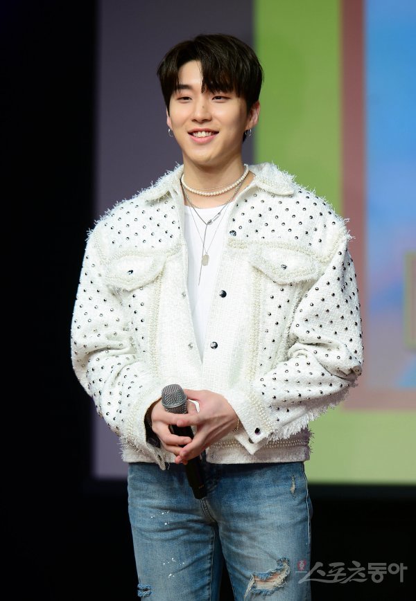 그룹 B.A.P 출신 가수 문종업이 7일 서울 강남구 청담동 일지아트홀에서 열린 첫 번째 싱글앨범 ‘HEADACHE(헤드에이크)’ 발표 쇼케이스에서 마이크를 쥐고 미소짓고 있다.