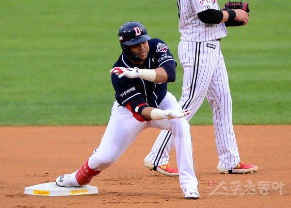 7일 서울 잠실야구장에서 ‘2020 신한은행 SOL KBO리그’ LG 트윈스와 두산 베어스의 경기가 열렸다. 1회초 1사 두산 페르난데스가 2루타를 날린 뒤 더그아웃을 향해 세리머니하고 있다.