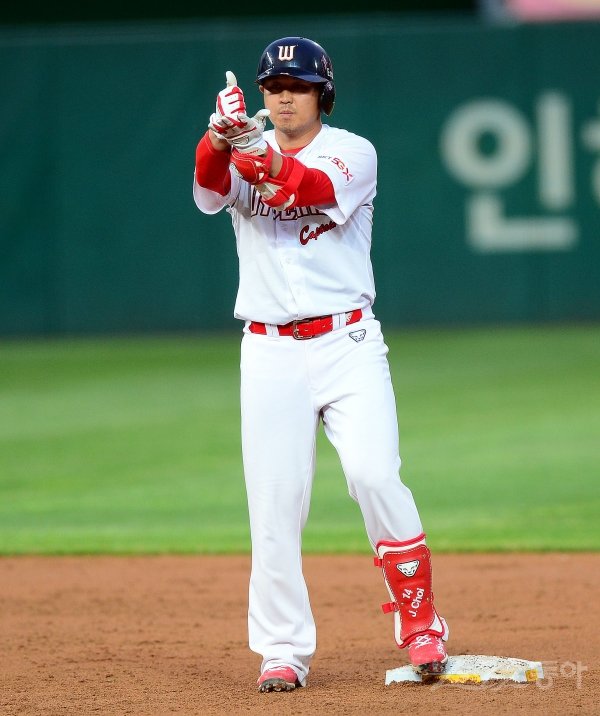 7일 인천 SK행복드림구장에서 ‘2020 신한은행 SOL KBO리그’ SK 와이번스와 한화 이글스의 경기가 열렸다. 3회말 무사에서 SK 최정이 2루타를 날린 뒤 ‘덕분에 챌린지’ 수어 세리머니를 선보이고 있다.