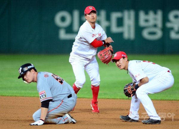 7일 인천 SK행복드림구장에서 ‘2020 신한은행 SOL KBO리그’ SK 와이번스와 한화 이글스의 경기가 열렸다. 4회초 1사 1, 2루에서 한화 송광민의 내야 땅볼 때 SK 정현이 공을 잡아 1루로 송구하고 있다.