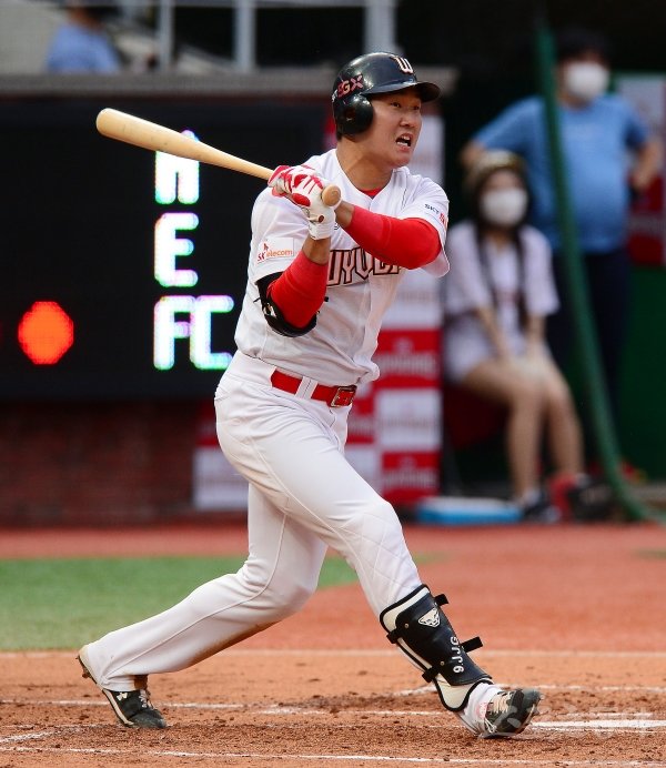7일 인천 SK행복드림구장에서 ‘2020 신한은행 SOL KBO리그’ SK 와이번스와 한화 이글스의 경기가 열렸다. 2회말 2사 1루에서 SK 정진기가 안타를 날리고 있다.