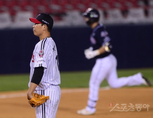 5회초 무사 1루 두산 박건우가 좌월 2점 홈런을 날리자 LG 정찬헌이 망연자실해 있다.