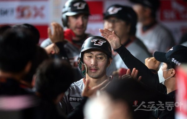 7일 인천 SK행복드림구장에서 ‘2020 신한은행 SOL KBO리그’ SK 와이번스와 한화 이글스의 경기가 열렸다. 6회초 2사 만루에서 한화 송광민의 2타점 적시타 때 득점에 성공한 정진호가 동료들의 환영을 받고 있다.