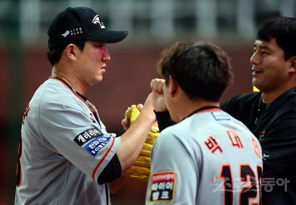 7일 인천 SK행복드림구장에서 ‘2020 신한은행 SOL KBO리그’ SK 와이번스와 한화 이글스의 경기가 열렸다. 6회까지 SK 공격을 2실점으로 막은 한화 선발 장시환이 이닝 종료 후 동료들의 환영을 받고 있다.