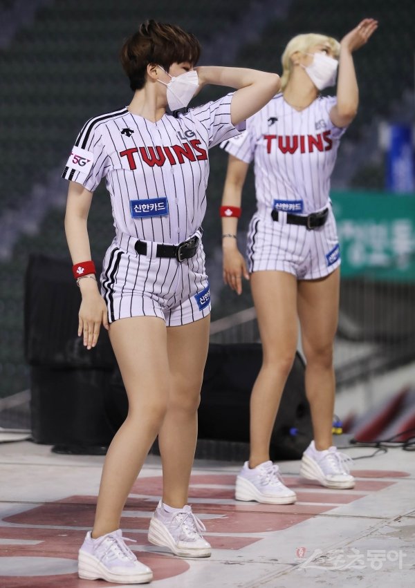 7일 서울 잠실야구장에서 ‘2020 신한은행 SOL KBO리그’ LG 트윈스와 두산 베어스의 경기가 열렸다. LG 하지원 치어리더가 응원단상에서 공연을 펼치고 있다.