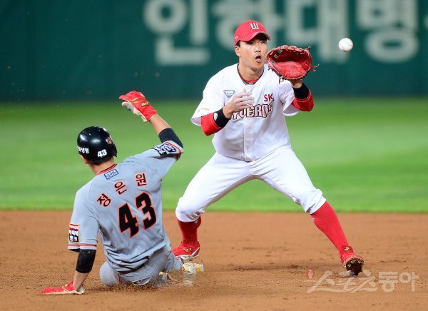 5회초 1사 1루에서 한화 정진호의 내야 땅볼 때 SK 정현이 1루 주자 정은원을 포스 아웃시키고 있다.