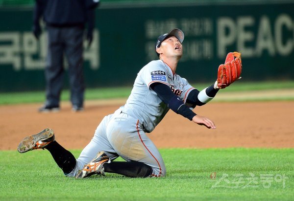 5회말 무사 1루에서 SK 로맥의 플라이 타구를 한화 송광민이 잡으려다 그라운드에 넘어지고 있다.