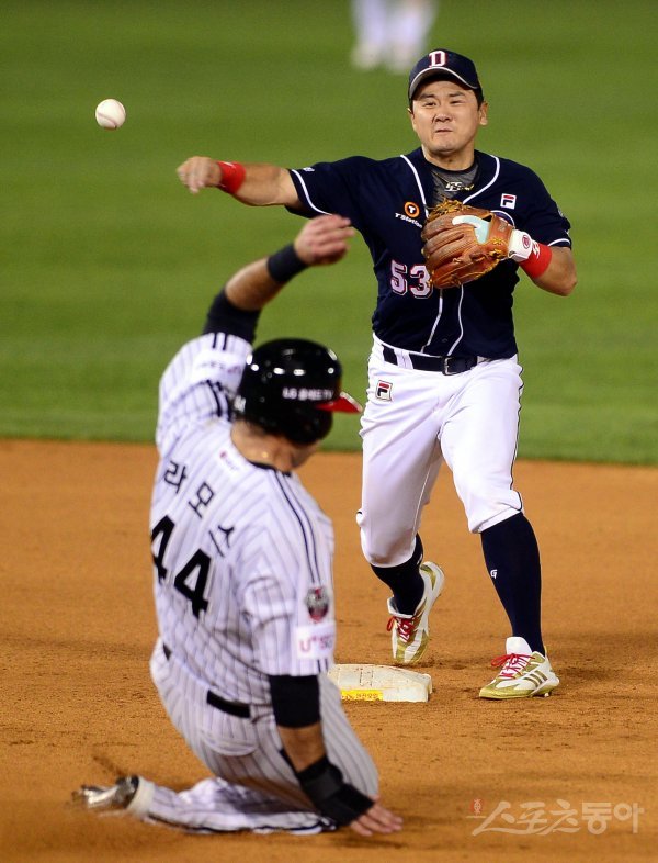 6회말 무사 1루 LG 채은성의 내야 땅볼 때 두산 최주환이 1루주자 라모스를 포스아웃 시킨 뒤 1루로 송구하고 있다.