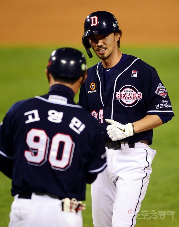 9회초 2사 2루 두산 오재원이 1타점 좌중간 적시타를 친 뒤 고영민 1루코치를 보며 웃고 있다.