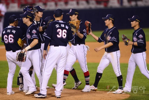 두산이 LG에 9-3으로 승리해 두산 선수들이 그라운드에 모여 기쁨을 나누고 있다.