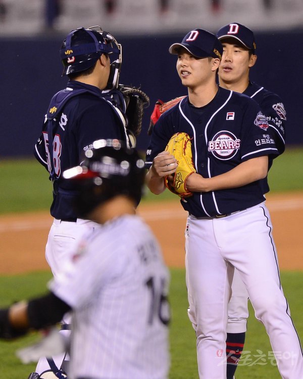 두산이 LG에 9-3으로 승리해 두산 박치국과 정상호가 대화 나누며 웃고 있다.