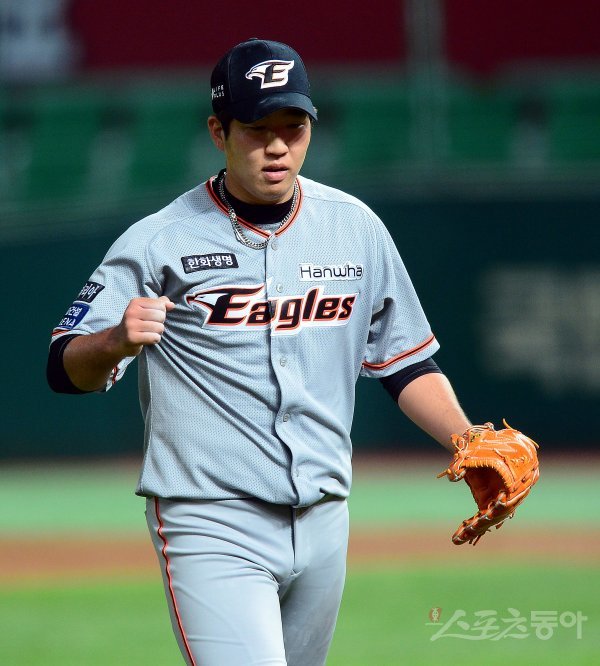7회말 1사 1, 2루에서 SK 정의윤을 병살로 아웃시킨 한화 박상원이 주먹을 쥐며 환호하고 있다.