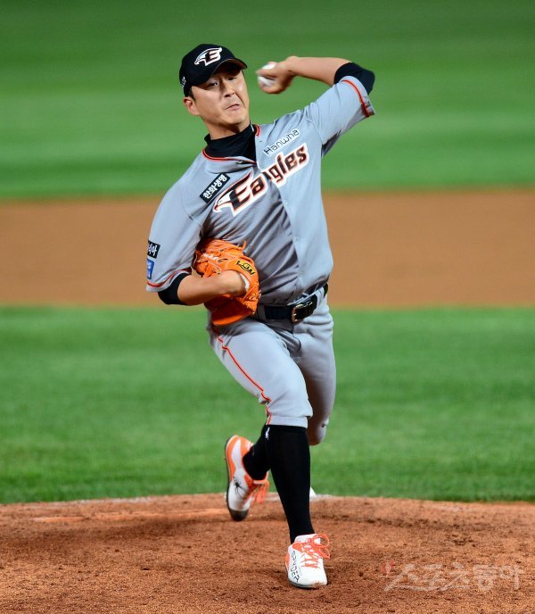 8회말 2사 1, 3루에서 한화 마무리 정우람이 구원 등판해 볼을 던지고 있다.
