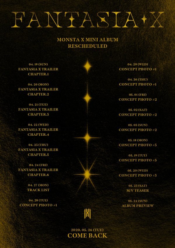 소속사 스타쉽엔터테인먼트는 8일 공식 SNS 채널에 몬스타엑스의 새로운 미니앨범 ‘FANTASIA X(판타지아 엑스)’의 스케줄 이미지를 게재하며 컴백 분위기를 달궜다.