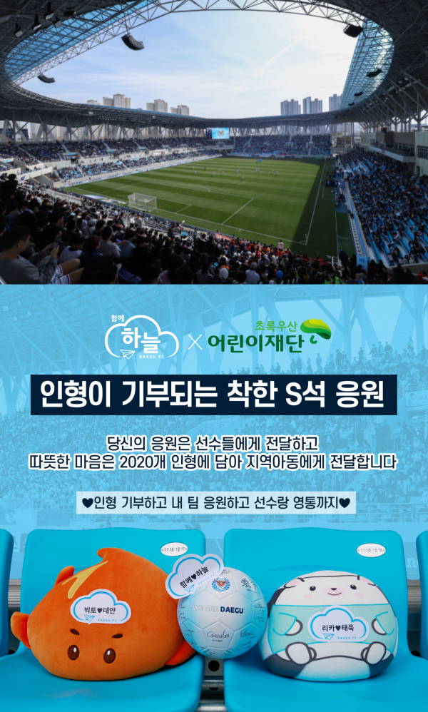 이번에 마련된 ‘인형이 기부되는 착한 S석 응원’은 대구FC가 새롭게 런칭하는 사회공헌 브랜드 ‘함께하늘’의 첫 번째 프로젝트다.