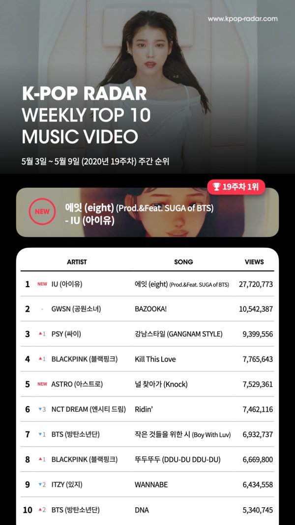 아이유의 ‘에잇(Prod.&Feat. SUGA of BTS)’ 뮤직비디오는 지난 3일부터 9일까지 집계한 2020년 19주차 주간 케이팝 레이더 주간 유튜브 조회수 차트에서 약 2,772만 뷰를 기록하며 1위에 올랐다.
