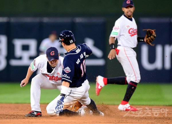 3회초 무사 1루에서 두산 허경민 타석 때 롯데 안치홍이 2루 도루를 시도하는 박세혁을 태그 아웃시키고 있다.
