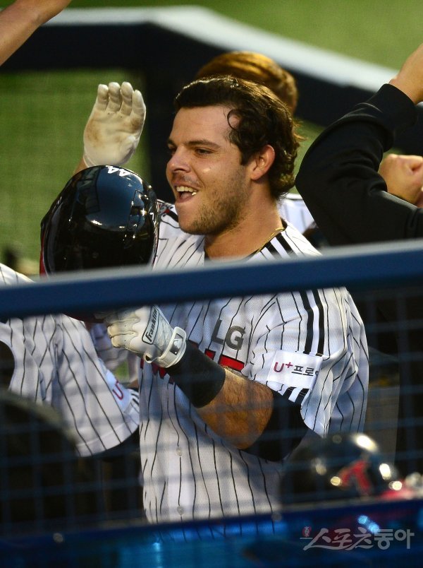 3회말 1사 1루 LG 라모스가 다시 앞서가는 좌중월 투런 홈런을 날리고 그라운드를 돌아 홈인해 하이파이브 하고 있다.