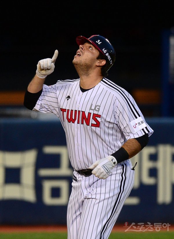 3회말 1사 1루 LG 라모스가 다시 앞서가는 좌중월 투런 홈런을 날리고 그라운드를 돌아 세리머니를 하고 있다.