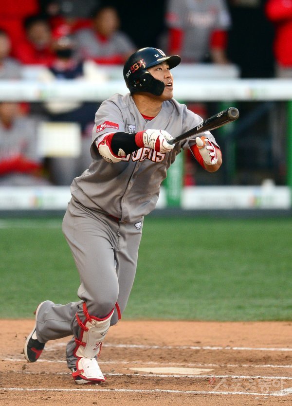 2회초 1사 1루 SK 한동민이 역전 우월 투런 홈런을 날리고 있다.
