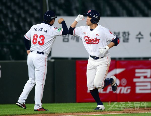 6회말 1사에서 롯데 전준우가 솔로 홈런을 쏘아 올린 뒤 윤재국 코치의 환영을 받고 있다.