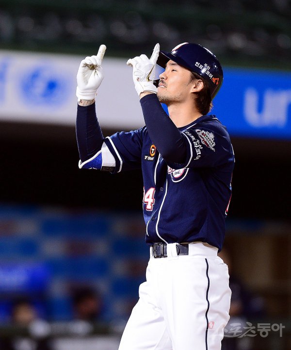 7회초 무사 1루에서 두산 오재원이 투런 홈런을 쏘아 올린 뒤 세리머니를 펼치고 있다.