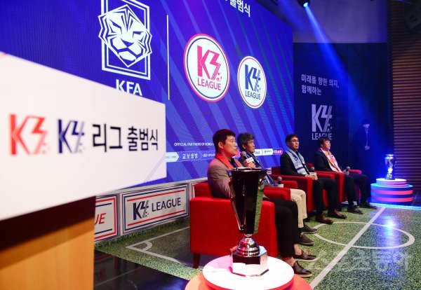 김포시민축구단 고정운 감독, 대전코레일축구단 김승희 감독, 천안시청축구단 김태영 감독, 화성FC 김학철 감독이 13일 서울 종로구 아산정책연구원에서 열린 ‘2020 K3-4리그 출범식’에서 미디어 토크쇼를 하고 있다.