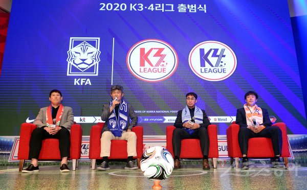 김포시민축구단 고정운 감독, 대전코레일축구단 김승희 감독, 천안시청축구단 김태영 감독, 화성FC 김학철 감독이 13일 서울 종로구 아산정책연구원에서 열린 ‘2020 K3-4리그 출범식’에서 미디어 토크쇼를 하고 있다.