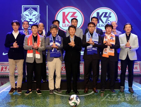 정몽규 회장, 홍명보 전무이사, 김포시민축구단 고정운 감독, 대전코레일축구단 김승희 감독, 천안시청축구단 김태영 감독, 화성FC 김학철 감독을 비롯한 대한축구협회 임원진들이 13일 서울 종로구 아산정책연구원에서 열린 ‘2020 K3-4리그 출범식’에서 기념 촬영을 하고 있다.