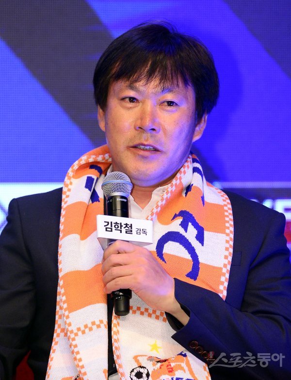 화성FC 김학철 감독이 13일 서울 종로구 아산정책연구원에서 열린 ‘2020 K3-4리그 출범식’에서 진행자의 질문에 답하고 있다.
