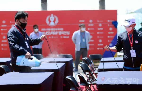 13일 경기도 양주 레이크우드 컨트리클럽에서 열린 제42회 KLPGA 챔피언십 골프 대회 미디어데이 전 방역 작업이 진행되고 있다.