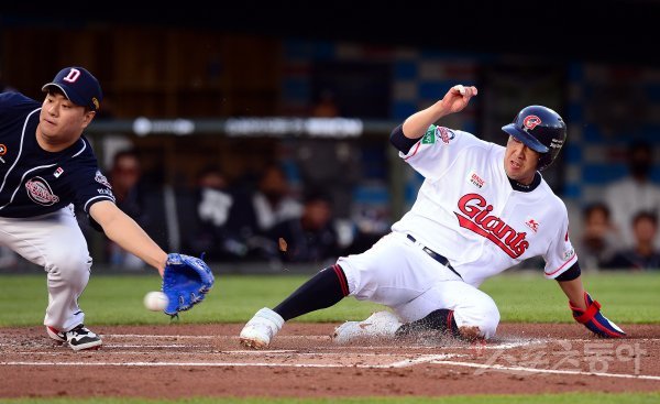 1회말 1사 1, 2루에서 롯데 이대호 타석 때 폭투로 2루 주자 전준우가 두산 이영하의 태그를 피해 득점에 성공하고 있다.