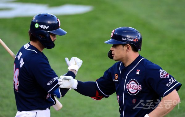 1회초 2사 1루에서 두산 김재환이 투런 홈런을 쏘아 올린 뒤 오재원의 환영을 받고 있다.