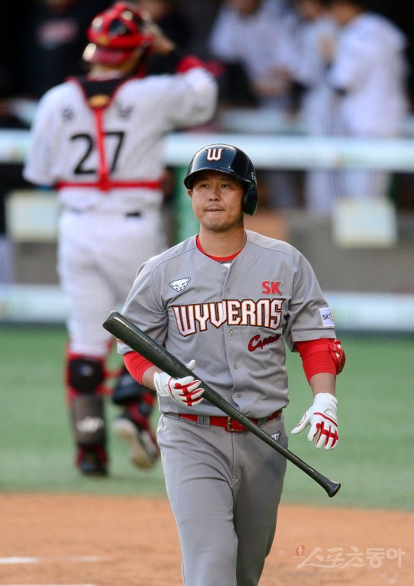 1회초 2사 SK 최정이 삼진 아웃을 당한 후 더그아웃으로 향하고 있다.