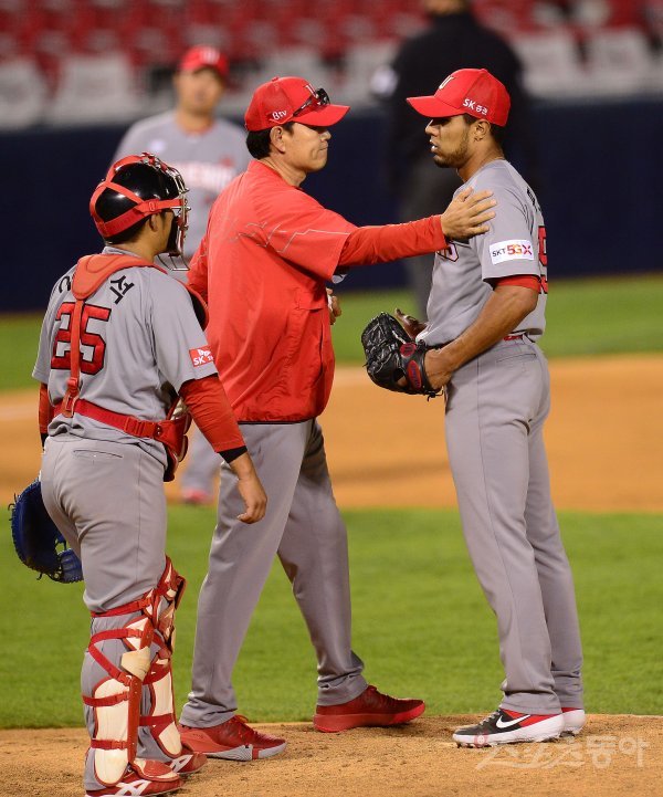SK 선발 핀토가 5회말 2사 상황에서 강판되고 있다.