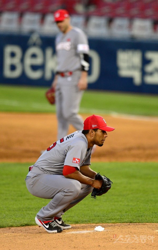 SK 선발 핀토가 2회말 2사 만루 상황에서 마운드에 앉아 생각을 하고 있다.