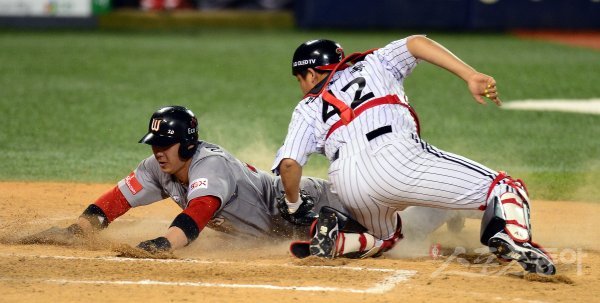 7회초 1사 1,3루 SK 외야 뜬공 때 SK 3루주자 이홍구가 태그업 시도했으나 아웃되고 있다.