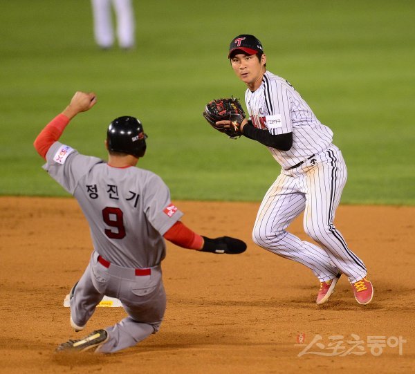 8회초 무사 1루 SK 내야 땅볼 때 LG 오지환이 1루루자를 포스 아웃시킨 후 1루로 송구하고 있다.